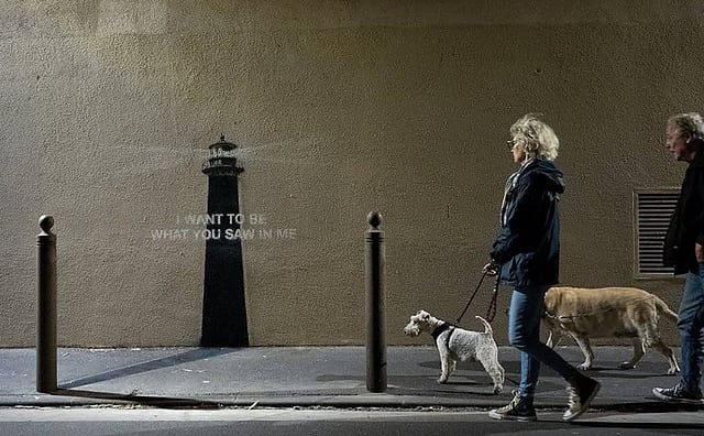 A new Banksy has officially been spotted! The mural of the lighthouse appeared overnight, painted discreetly on a wall down a quiet street in Marseille. The image, shared on the artist’s Instagram account, cleverly transforms the shadow cast by a street bollard into the shape of a lighthouse. Across the beam, stenciled in white, are the words: “I want to be what you saw in me.”