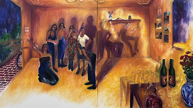 Reminiscing the inspiration behind the artworks she mentions, “Growing up in a fast-pacing ever-growing city of people quarrelling, celebrating, condescending, and picking at each other, I absorbed micro stories from nameless parties hosted much too often, which stayed with me for a long time. While things seemed happy and okay from the outside in these parties of wealth and privilege; the longer I observed, the more I found, feelings, people, women, unheard, even when they screamed in silence. I ponder over the overwhelm, extravagance and vanity of such events in my super-real memoirs.”