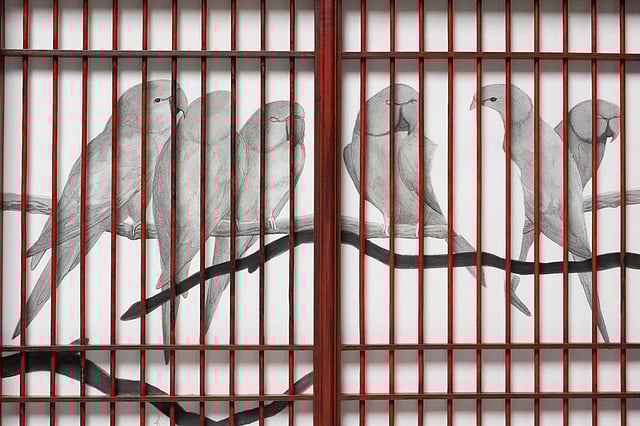 Dave mentions, “The idea of space as performance has been central to performance theory, particularly in the work of Erika Fischer-Lichte, who reminds us that performance is transformative precisely because it places the spectator inside the act rather than outside it. The visitor in this exhibition is not passive. They cross thresholds, voids, and suspensions, walking beneath Sudipta’s fragile paper figures cascading from above, detouring around Chandan’s carved landscapes, or pausing before Firi’s ecological drawings unfurling across the walls, confronting Komu’s politically charged figuration that transforms the gallery into a site of dialogue and dissent. The gallery itself performs. Its false partitions, beams, and windows fold into the dramaturgy, creating an environment where architecture and artwork together choreograph how we move and feel.”