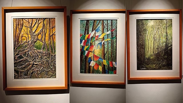For someone who has never been to the hills or witnessed the natural sceneries, would feel drawn to the serpentine roads drawn from the individual’s perspective, which almost calls you to pack your bags and begin the journey. The River of Glass, with a boat oared on the crystal clear waters of Meghalaya or large trees with innumerable roots gutting out in acrylic on paper, watercolour on paper, and mixed media on paper, gives a 3D effect to each of the paintings, making them come alive and almost draw you in.