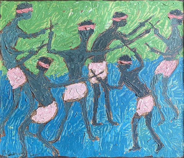 Curated by Sharan Apparao, the exhibition draws from Perumal’s sustained engagement with rural life in Tamil Nadu. His works emerge from environments shaped by agricultural labour, ritual, belief, and collective presence. Figures in his artworks are inseparable from their surroundings, carrying the marks of the shared time. As Sharan puts it, his works function as “a documentation and act of spontaneity to connect with his own environment and history.”