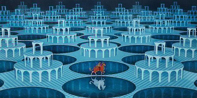 Makwana, who was born in 1989 and trained at the Maharaja Sayajirao University of Baroda, has built a practice anchored in observation, of domestic rituals, fleeting encounters, inherited myths, and the small decisions that quietly contour inner life. His paintings locate these moments within dense, layered compositions that feel at once personal and archetypal. Figures travel, pause, gather, entangle themselves in patterns; landscapes stretch and fold back into rooms; architecture appears less as structure than as mental scaffolding.