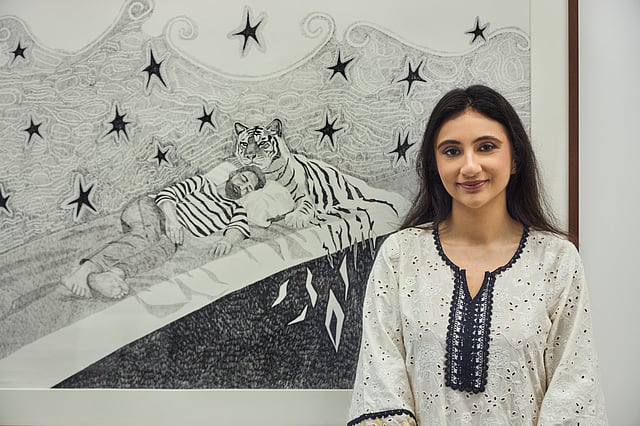 The tiger has become a recurring presence throughout this body of work. According to the artist, it first appeared in her dreams before gradually finding its way into the drawings.