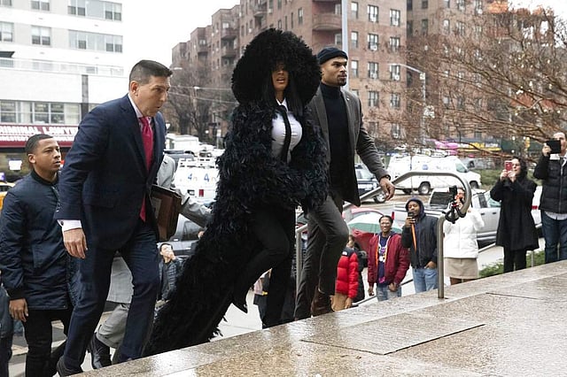 The Grammy-winning rapper sported a feather-trimmed black coat with a long train and a wide-brimmed black hat to her court date in Queens, where she faces felony charges stemming from an August 2018 fight at a strip club.