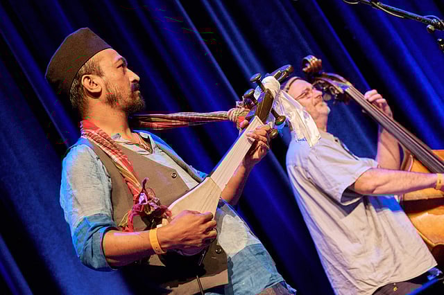 One of the great strengths of this band is its diversity. Raju Das brings his beautiful baul songs and amazing khamak. Gaurab Chatterjee brings his experience as a rock drummer and his fantastic dubki, the folk hand drum used in baul. Deoashish Mothey has been rightly described as a ‘little orchestra’, and not only does he sing in Hindi, English and Nepali but also plays esraj, dotora, guitar and machunga with élan. Further, Steve Elphick brought more versatility with the double bass and my baritone saxophone blended gently to provide a wonderful sonic contrast to the Indian instruments.