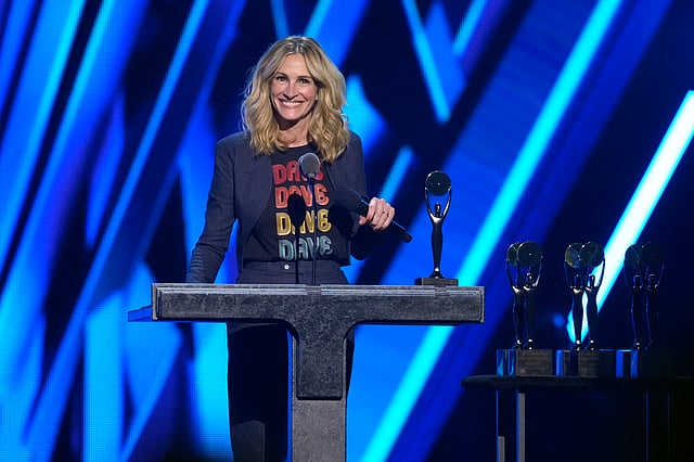Roberts helped induct Dave Matthews Band — she’s a self-avowed superfan and she appeared in the band’s video for the 2005 single, Dreamgirl. Roberts, wearing a band T-shirt, said the appeal of the group is “spontaneous abandon,” adding the first time she danced with her husband was to one of their songs.