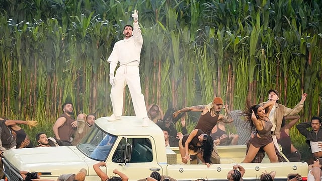 The performance concluded with a striking tableau of power poles during El Apagón, referencing recurring power outages and collective memory. A light blue Puerto Rican flag appeared towards the end, followed by a roll call of countries across the Americas, framing the show as an exploration of shared identity through symbolism rather than spectacle.