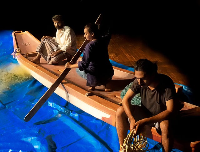 The play is almost written like a chamber play — all scenes can take place in one space, characters enter and exit onto the same patch of beach within a fishing village. We got in touch with the fishermen in a fishing village close by Auroville in order to get an actual fishing boat from them. In our representation of a beach, we chose to create a slightly abstract version of what beaches all over the world look like today — all we did is we organised a beach clean-up nearby. The trash that we collect will be put as pieces of art trouvée, on the stage itself. That way, the characters find themselves in an environment that shows a development that we can already anticipate. At the same time, it represents the desolate state in which a lot of communities all over the world find themselves nowadays. They managed to progress materially, but not intellectually nor ethically and that is one reason why conflicts arise.
