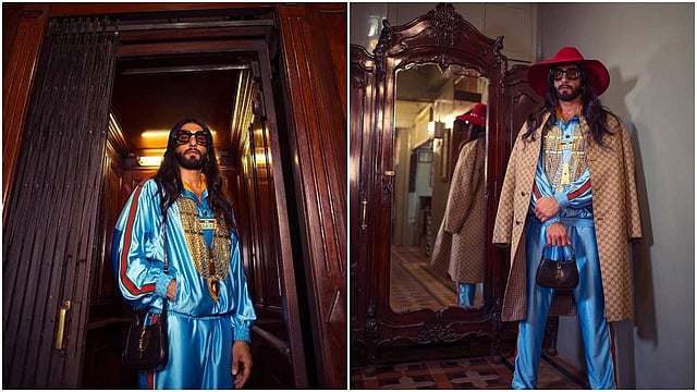 In the latest images, Ranveer Singh sports a striking blue shiny technical polyester jersey featuring the Gucci vintage logo label and green and red Web ribbon detail. He pairs it with a handbag from Gucci’s Jackie collection, a long collared GG coat by Gucci, and he also throws in some retro shades and long hair extensions, seemingly channeling a Jared Leto-esque vibe.