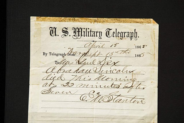 The telegram reads: "Abraham Lincoln died this morning at 22 minutes after seven."