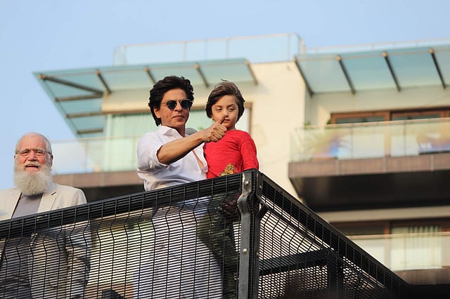 In one of the viral videos, SRK is seen teaching Letterman how to gesture a salaam. Dressed in a white kurta pyjama, SRK aced the ethnic look on Eid. Letterman wore a beige coat. From posing in his signature 'arms wide open' pose to kissing AbRam, exchanging smiles with Letterman and giving flying kisses to the gathering of fans -- Shah Rukh's Eid celebration was quite a treat.