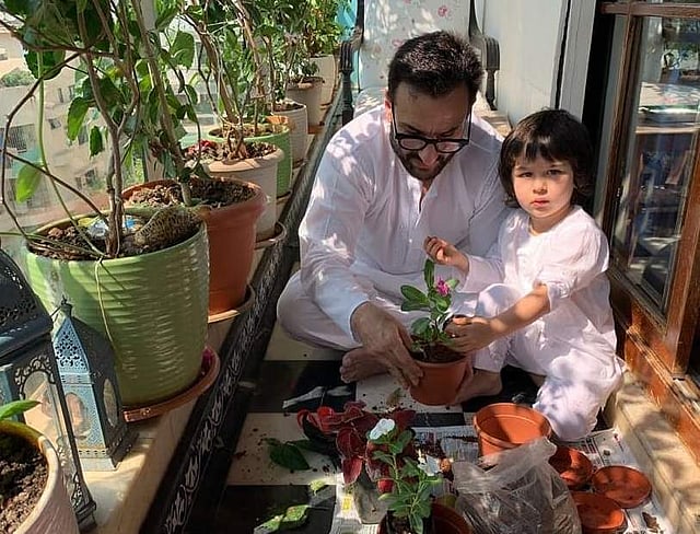 Kareena shared a few photographs on her Instagram account in which we can see Saif and Taimur planting saplings in their house's balcony.