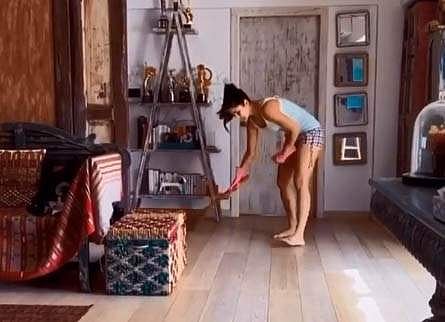 After her videos of dishwashing, working out, and strumming the guitar trended over the past few days, the actress has now taken to sweeping up, to stay occupied at home.
