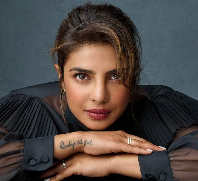 The cover of the book features a close-up picture of Priyanka, in which she is resting her head on her hands, and the tattoo 'Daddy's lil girl' on her right wrist is visible.