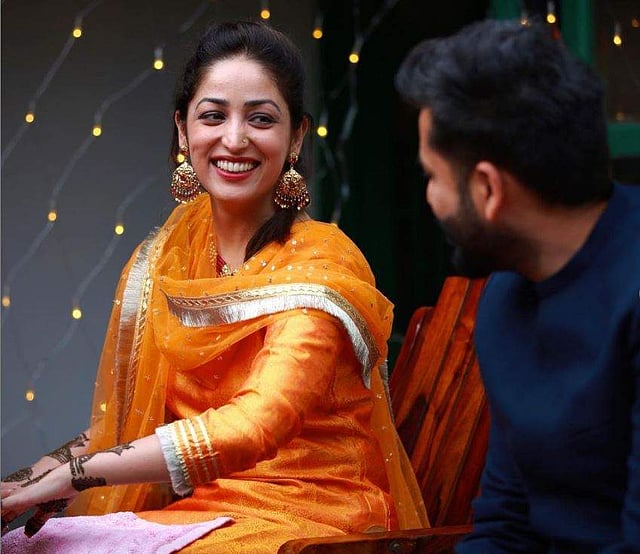 Dressed in a marigold yellow salwar kameez, sporting large earrings, and minimal makeup, the actress looks resplendent as the bride-to-be. Yami also posted images of her hands with henna on them. A profile angle of Aditya shows that the groom-to-be was dressed in a black bandhgala.