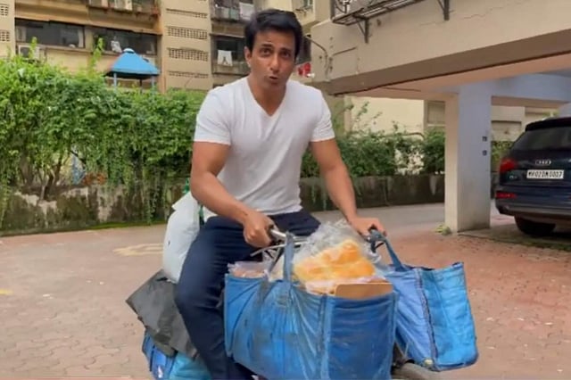 Sonu Sood, who has won the hearts of his fans through his philanthropic work over the last one year during the COVID-induced lockdown, has now posted a fun, light-hearted video where he was seen selling eggs, bread, chips, and other groceries on a bicycle.