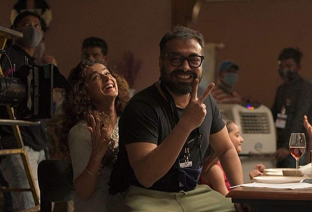 In the picture posted by Anurag, you can see the duo having fun on the sets. Donned in a sheer net saree and sitting on a chair, the actress looked quite cheerful. And, her director, Anurag can be seen sitting on Taapsee’s lap and posing.