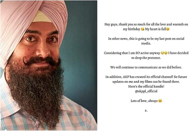 "Hey guys, thank you so much for all the love and warmth on my birthday. My heart is full. In other news, this is going to be my last post on social media. Considering that I am so active anyway I have decided to drop the pretence. We will continue to communicate as we did before. In addition, AKP has created its official channel! So future updates on me and my films can be found there. Here's the official handle! @akppl_official Lots of love, always a," Aamir wrote.