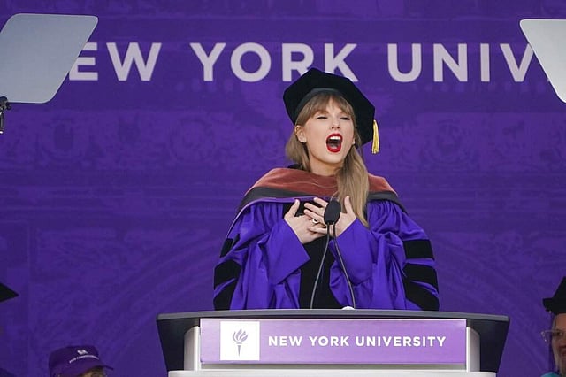 Wearing her signature red lipstick and a newly awarded, purple honorary robe, Taylor cracked a joke to the thousands of graduates assembled: “I’m 90% sure the main reason I’m here is because I have a song called 22.”