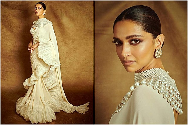 On the last day of the film fest, Deepika opted for a ruffled, off-white, fusion sari with a trail and dramatic pleated ruffles from designer duo Abu Jani and Sandeep Khosla. The ensemble was elevated with a bustier that featured pristine white pearls and crystals, and a statement pearl necklace from the same label. The actress completed the look with a pair of stone-studded earrings. With her tied in a sleek bun, she added to the finishing touches with smokey eyeshadow, well-defined eyebrows, kohled eyes, highlighted cheeks, and nude lip colour.