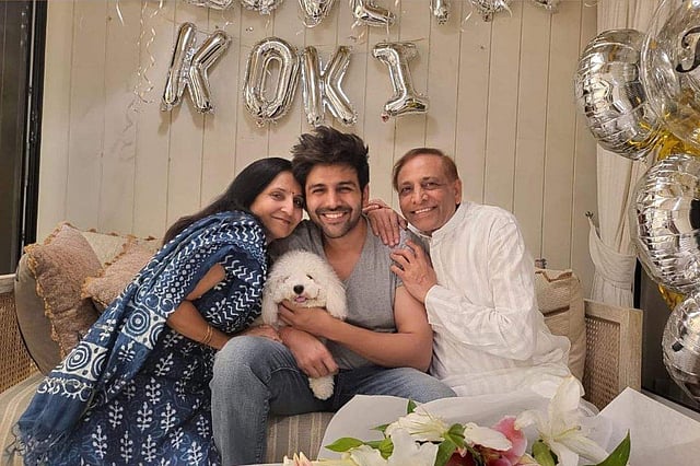 Bollywood actor Kartik Aaryan who turns 32 today, took to Instagram to share some pictures from his surprise midnight birthday celebrations with his family. In the photos, we can see the actor sitting on a sofa to cut his birthday cake.
