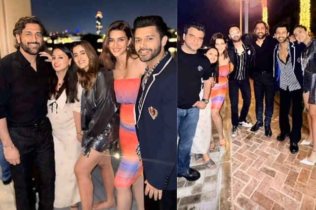 Stebin, capturing the star-studded moment, treated fans to a group picture featuring Dhoni, Sakshi, Kriti, Nupur, and himself. Dhoni looked dapper in a black shirt and trousers, while Sakshi stunned in a white dress. Kriti donned an orange-purple dress, and Nupur rocked a chic black and grey short dress.