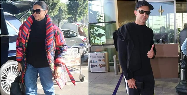 Deepika Padukone arrived at the airport wearing a black blouse, blue jeans, and a vibrant jacket. She completed the look with black boots. She entered the gate with a bright smile on her face and her hair tied in a bun. Hrithik arrived at the airport around the same time dressed in black casuals and a matching cap.