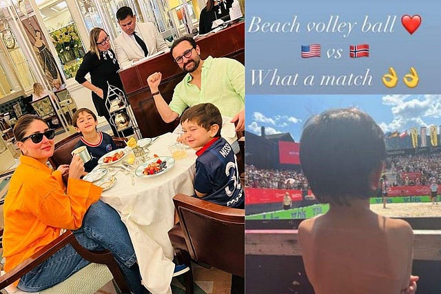 The first snap shared by Kareena showed the greenery around the hotel she is staying at through the balcony. She wrote, “Good morning (rainbow and red heart emojis).” The next image featured her son Taimur Ali Khan watching a volleyball match in a stadium. In the picture, the kid was shirtless and had his back turned towards the camera. Kareena captioned the pic, “Beach volleyball (red heart emoji).”