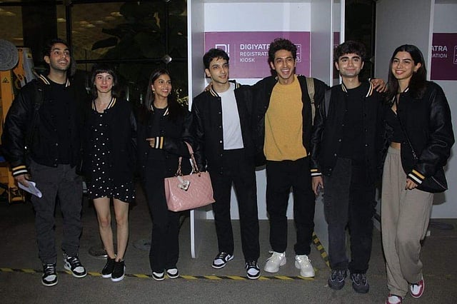 The cast of the upcoming Netflix film The Archies left for Brazil on Monday to attend a fan event on June 17. The cast which includes Suhana Khan, Khushi Kapoor, Agastya Nanda, Aditi Saigal, Vedang Raina, Mihir Ahuja and Yuvraj Menda, was photographed at the Mumbai airport and they all were seen donning matching black jackets with Netflix and The Archies printed on the back.