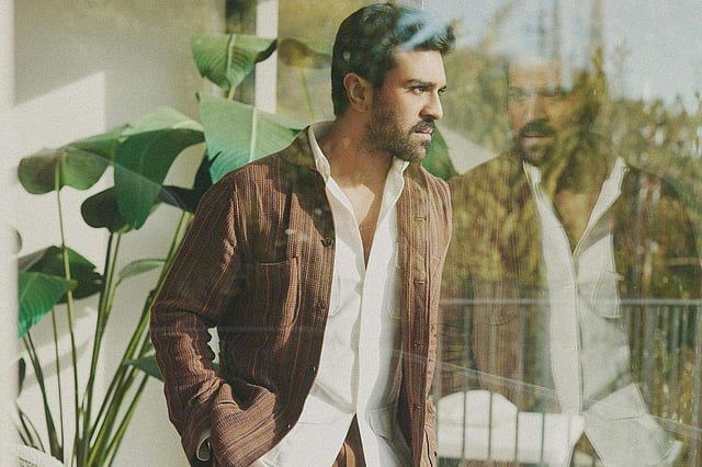 Ram Charan's linen jacket had a tailored fit and was embellished with pinstripe patterns in various brown tones. It also had a collared neckline, front pockets, button closures, an open front, full-length sleeves with open cuffs, and an open front. He layered the jacket over a white shirt with long sleeves, pockets, and a slim, figure-hugging fit.