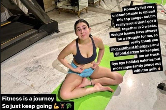 Taking to Instagram Stories, Sara shared a collage of herself, wherein in one picture she is seen sitting on the gym floor, wearing a sports bra and shorts, and holding on to her belly fat. She is posing for the camera with a sad face.