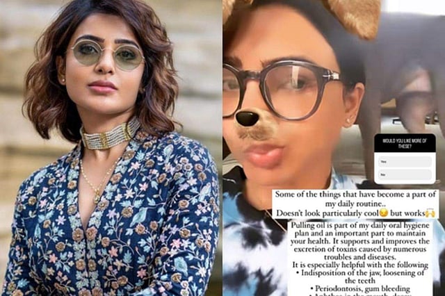 Actress Samantha Ruth Prabhu, who is an avid social media user and keeps her fans updated with her day to day life updates, now shared her daily oral hygiene routine, saying how it plays an important part to maintain one’s health. Taking to Instagram stories, Samantha shared a video wherein she can be seen using cute dog filter and doing oil pulling. The actress is wearing a tie-dye Tshirts, with her pet dog playing behind her.