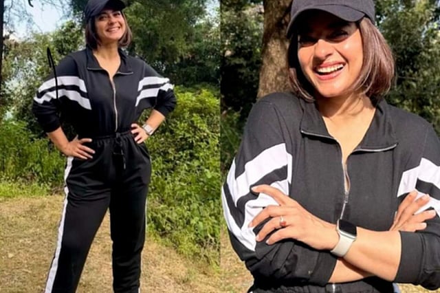Kajol wore a black jogger set, with a matching cap and short hair. She is seen posing in a picturesque location with trees in the backdrop. The background score is the song Yeh Ladka Hai Deewana.