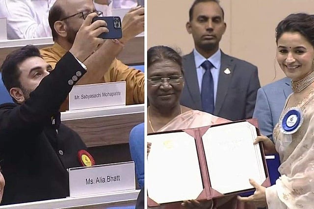 The actress was accompanied to the award ceremony by her husband and actor Ranbir Kapoor. The actor was seen wearing a black outfit. But what netizens are gushing about is an image that has now gone viral. It shows that as Alia goes up the stage to receive the honour from the president, hubby Ranbir is busy beaming and recording the moment on his mobile camera. Fans are just not getting over how adorable and "genuine" the gesture is. Here is how an X (formerly Twitter) user reacted: