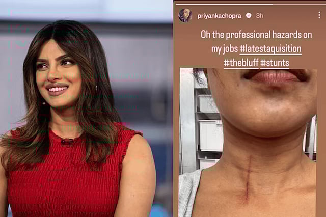 The actress shared an update on her Instagram Stories, where she posted a photo showing a noticeable cut just below her throat. Despite the injury not appearing too severe, it surely looked painful. In the caption accompanying the photo, Priyanka reflected on the occupational hazards that come with her profession, adding hashtags like "#latestacquisition", "#Stunts" and "#TheBluff". Despite the setback, she remains dedicated to her work, showcasing her resilience and professionalism in the face of challenges.