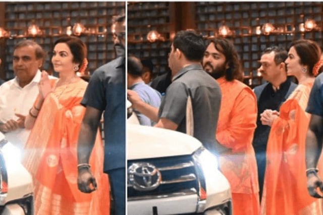 Mukesh is dressed in black slacks and a white shirt, while Anant and his mother Nita both wear orange. A media outlet also shared a video of Isha Ambani's husband, Anand Piramal, arriving at Antilia, captioned, “Mukesh Ambani’s son-in-law Anand Piramal arrives at Antilia for the intimate dinner with Ambani family and RSS chief Mohan Bhagwat.”