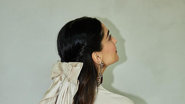 Sonam opted for glossy pink lips, pink eyeshadow, blushed cheeks and thick brows. She kept her hairstyle middle parted, and half tied them with an off-white matching satin bow clip, leaving the rest of the hair open.