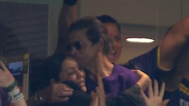 In another set of video, we see the actor hugging and kissing Gauri Khan who sat with him throughout the match and cheered for KKR.