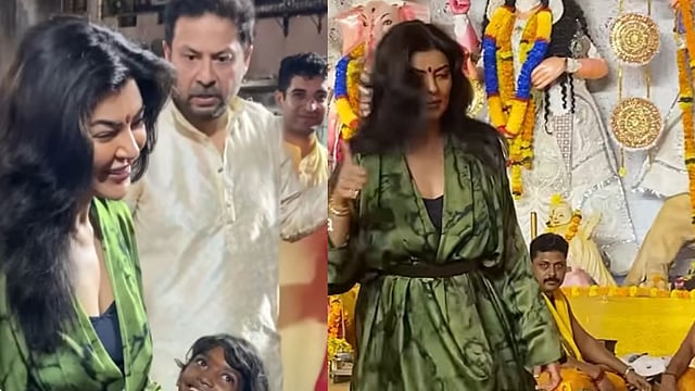 Among the prominent figures who attended the festivities was actress Sushmita Sen, who was accompanied by her boyfriend Rohman Shawl and daughter Alisah Sen. Sushmita, known for her unconventional style, opted for a printed green top instead of the traditional sari. She bowed down before the idol with reverence and greeted the priest with a warm smile.