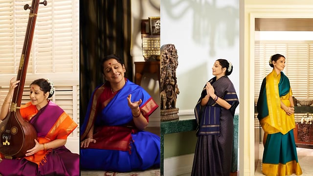 Anu Parathasarathy, renowned for her extensive work in the film industry, immediately saw the potential of bringing M.S. Subbulakshmi’s elegant concert persona to life. With guidance from Sikkil Mala Chandrashekhar, the legendary singer's granddaughter-in-law, Anu carefully researched and recreated four sarees that M.S. Subbulakshmi wore between the 1960s and 1980s. These sarees were a nod to the legendary weavers Muthu Chettiar and Nalli Chinnasami Chetty, whose creations were synonymous with the Queen of music's style. Vidya's look, styled with precision, captured the simplicity that M.S. Subbulakshmi was known for, yet didn’t shy away from the vibrancy of the South Indian aesthetic.