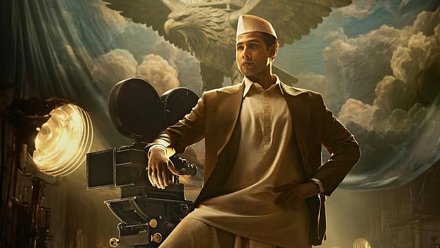 The striking first-look image captures Siddhant in a vintage, period setting. He is dressed in traditional Indian attire, complete with a Nehru cap, standing confidently beside a classic film camera. The grand cinematic backdrop, featuring a majestic eagle against a cloudy sky, visually underlines the film's tagline: “The Rebel Who Redefined Indian Cinema Is Back Where He Belongs — On the Big Screen.”