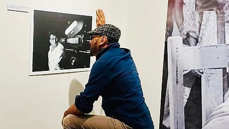 In the image, the Teri Meherbaniyan actor is seen sitting on one leg intently watching a portrait of Subhash Ghai, capturing a moment of quiet admiration and deep respect.
