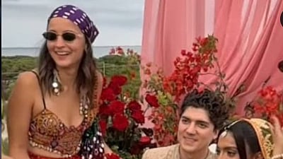 After her dazzling yet controversial "saree" look at Cannes Film Festival 2025, Alia Bhatt was seen flying to Spain to attend her best friend’s wedding! The actress joined her BFF Tanya Saha Gupta and fiancé David Angelov’s wedding celebration in Spain recently. A video from the festivities went viral on social media, and the actress made our heads turn in a unique fusion look, where she was seen pairing a traditional lehenga with a bandanna and sunglasses, and fans are going gaga over her look! Alia’s friend and actress Akansha Ranjan Kapoor was also seen in the video!