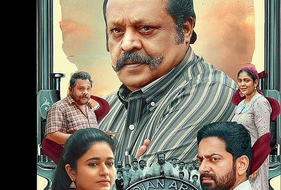 The poster features photos of Suresh Gopi, Poonam, Shaiju, Haresh Kanaran and Srinda. Behind the title, there is a logo of the Indian Army and a bunch of people are seen marching together. Suresh Gopi is assumed to be playing an ex-army man hailing from Malappuram.