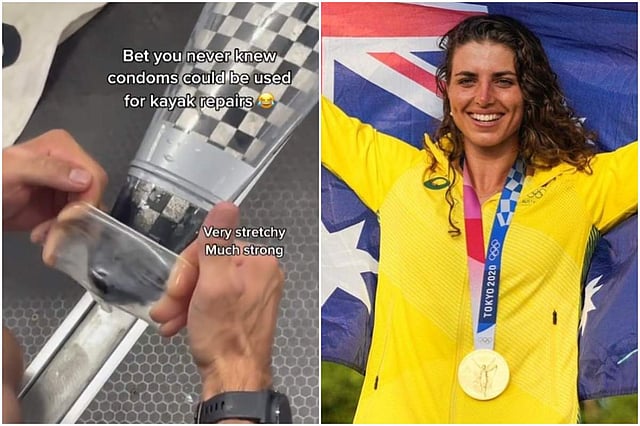 Australian slalom canoeist Jessica Fox, who bagged a bronze medal and a gold medal at the Tokyo Olympics 2020’s canoe slalom event, shared an interesting behind-the-scenes video in which she had used a condom to fix one end of the kayak.