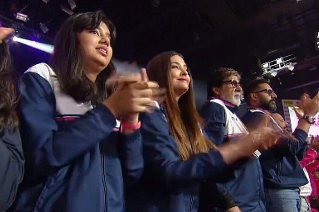 Aishwarya Rai, Amitabh Bachchan, and Aaradhya Bachchan recently stole the spotlight as they transformed into enthusiastic cheerleaders for Abhishek Bachchan's kabaddi team, Jaipur Pink Panthers. The star-studded family attended a thrilling match at Mumbai’s Sardar Vallabhbhai Patel Indoor Stadium against U Mumba, sporting the vibrant Jaipur Pink Panthers jerseys alongside Abhishek.