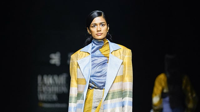 “The filmmaker sort of became the focal point based on how he has worked with colour and India being an integral part of his works, we called it Moonrise — it was almost like an illusion,” the designer reveals. Using ingenious weaving techniques, the designer transformed the yarn into tailored trench coats, puffer jackets, skirts and tops detailed with bright ochres, muddy reds, blues, pinks and ivory, along with colour blocking, ruching and metallics.
