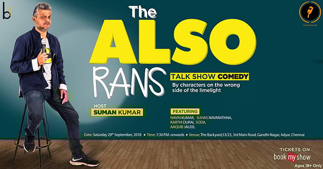 Chennai Comedy is hosting The Also Rans, a comedy talk show with Suman Kumar as he speaks to famous guests, who reveal their hilarious stories. The show will have Suman in conversation with Chennai-based artistes Navin Kumar, Suhas Navarathna, Karthi Durai, Soda and Aaquib Jaleel.