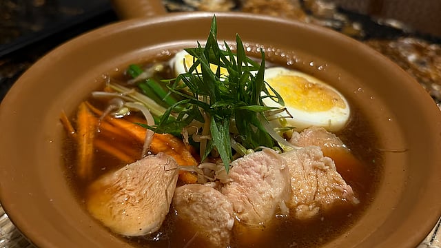 The chef also swears by the Seafood Ramen, served in a delicate seafood broth. With thin-cut noodles laid over kani (crab sticks), grilled fish, and a miso base, this bowl evokes the refined seafood flavours of Tokyo. For vegetarians, there’s a Pad Thai-style ramen made with flat rice noodles, tofu, and veggies in an umami broth. It stays authentic to its Thai roots with flat rice noodles, mushrooms, asparagus, spinach, and corn. Mildly tempered with spices, the bowl was filling and satisfying.