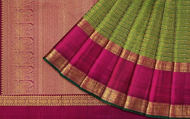 Chennai-based brand Kanakavalli is hosting a three-day pop-up featuring checked and striped Kanjeevaram silk saris. Showcasing an array of drapes, this collection features bright colour blocks, gingham prints, broad colour bands and delicate pinstripes.